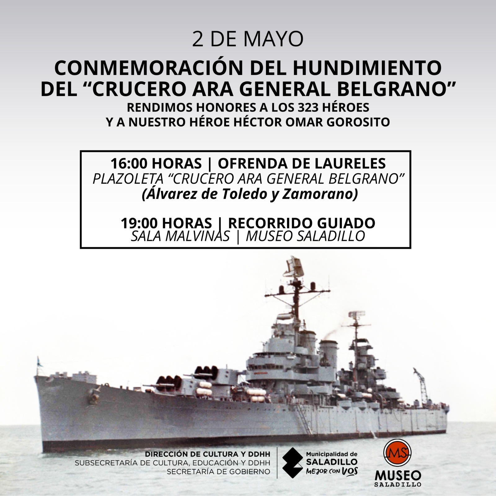 Saladillo/BA. En el marco de un nuevo aniversario del hundimiento del ARA General Belgrano, se llevará a cabo en Saladillo una jornada conmemorativa para rendir homenaje a los 323 héroes caídos y, especialmente, al vecino Héctor Omar Gorosito.