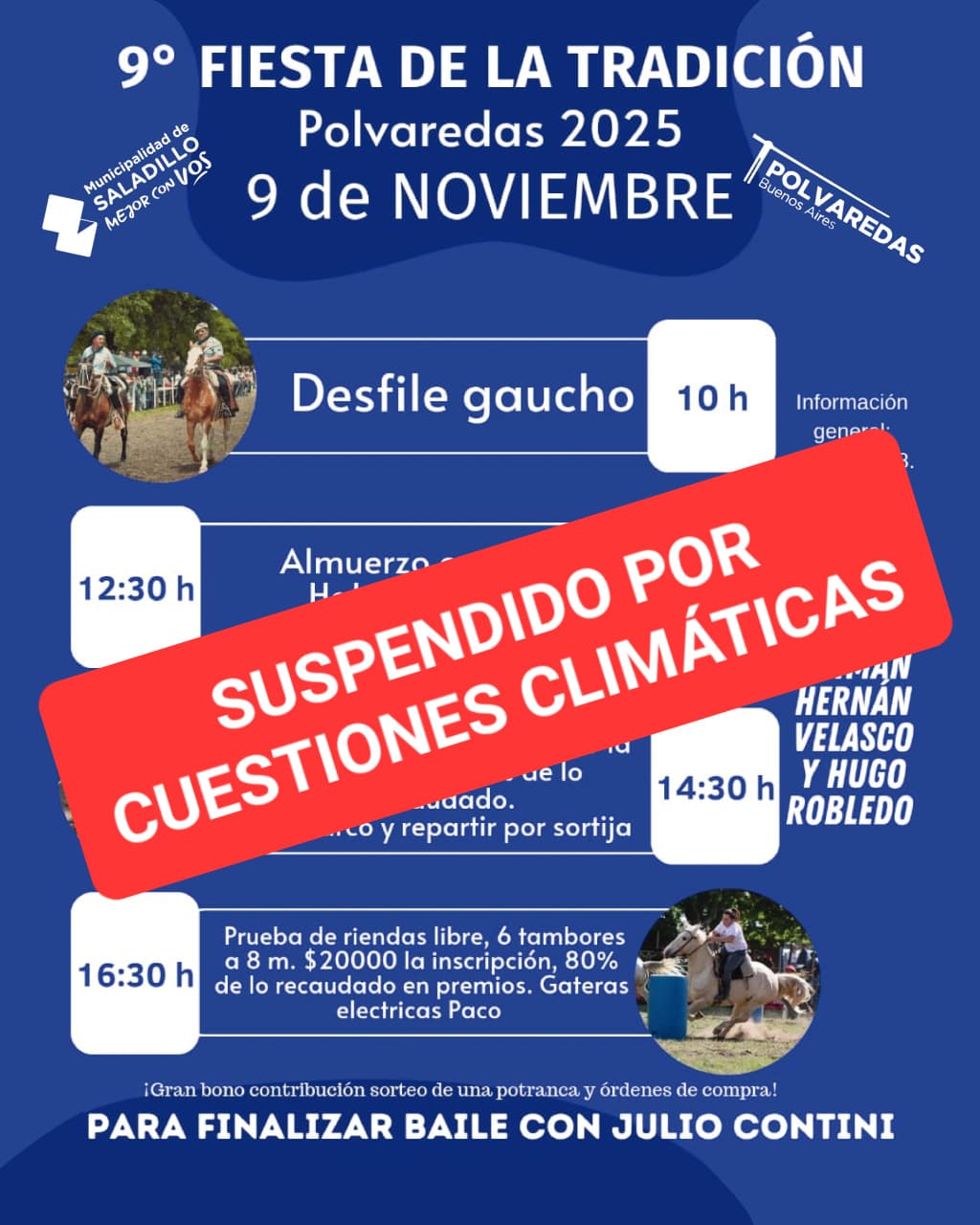 Buenas NoticiasdestacadosSaladillo9º Fiesta de la tradición en PolvaredasPor Redación Saladillo - noviembre 5, 2025Polvaredas/BA. El evento del 9 de noviembre en polvaredas, se suspende por cuestiones climaticas.