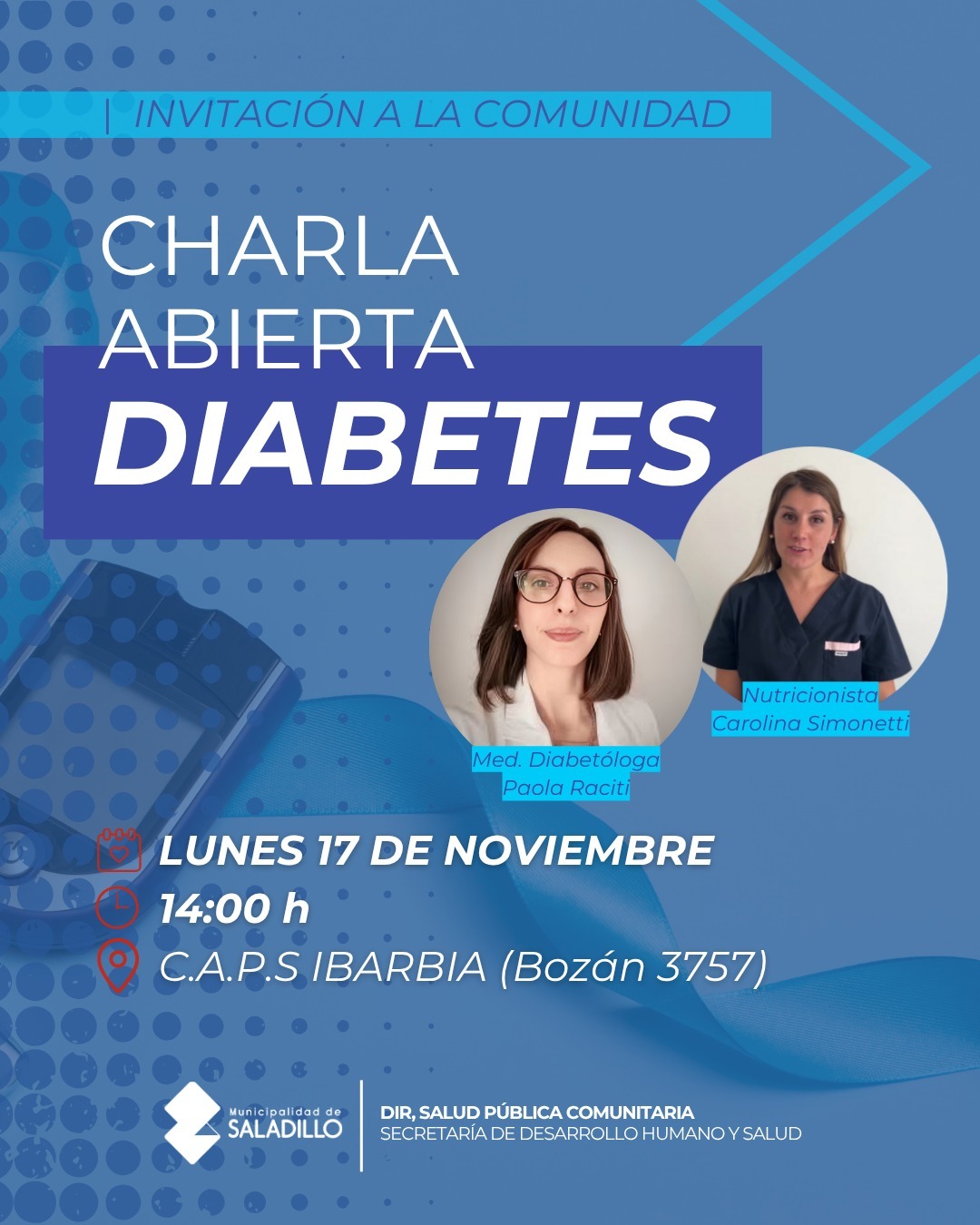 Saladillo/BA. En el marco del «Día Mundial de la Diabetes», invitamos a participar de esta charla abierta que se realizará el lunes 17 de noviembre a las 14:00 h en el C.A.P.S. Ibarbia.