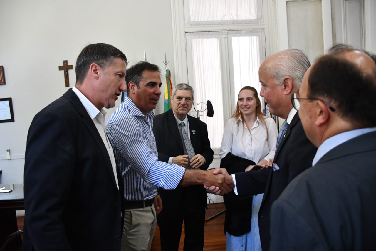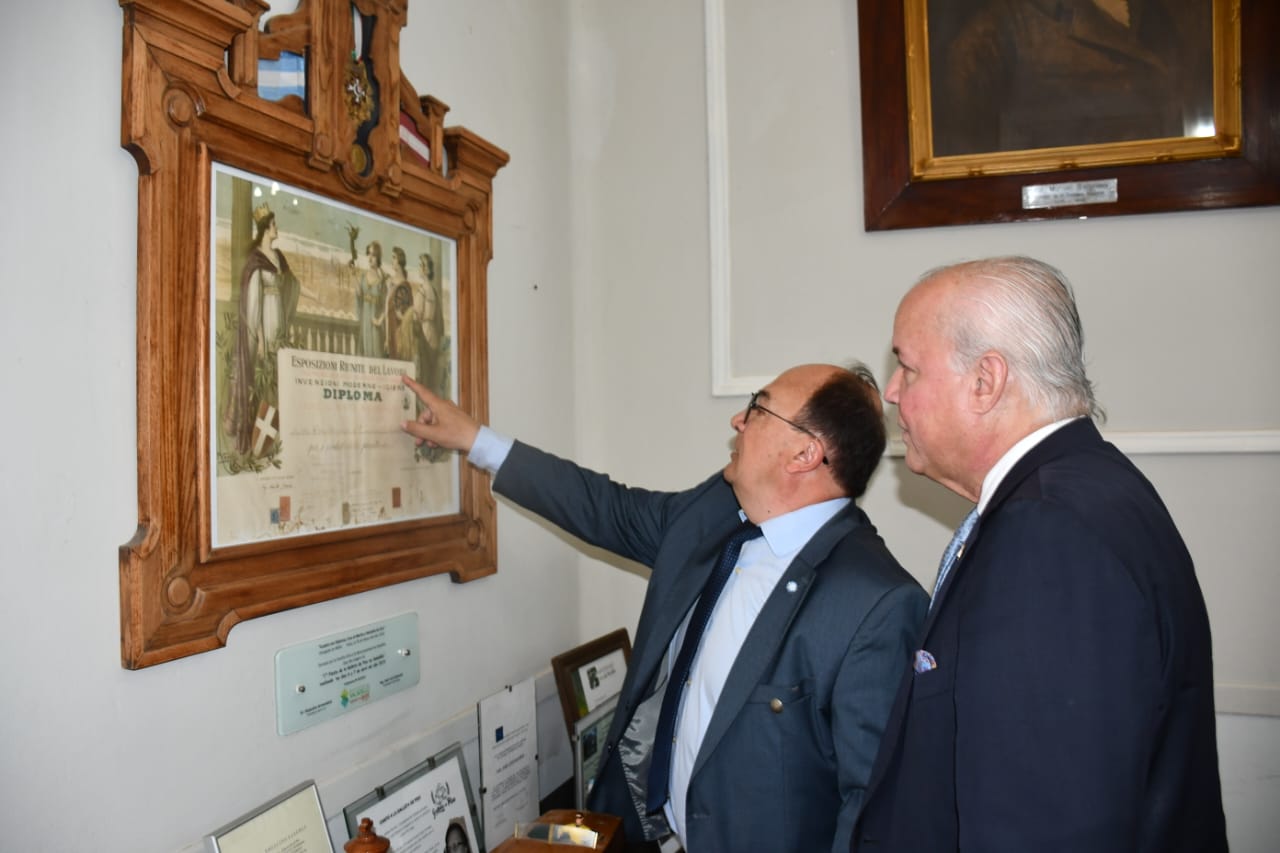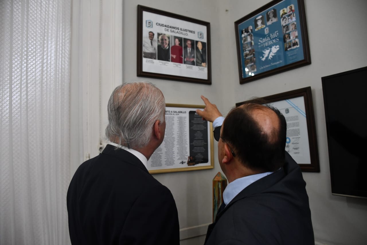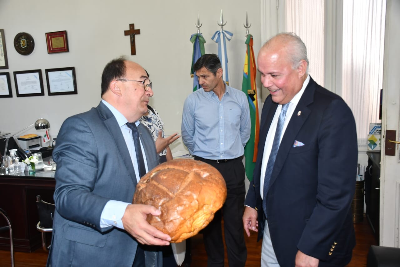 Saladillo/BA. Luego del acto institucional desarrollado en el hall central y antes de la importante reunión mantenida con empresarios y comerciantes locales, el Embajador de Panamá en nuestro país estuvo en el despacho del Intendente Salomón conociendo aspectos emblemáticos de la historia saladillense como la Fiesta de la Galleta de Piso entre otros.