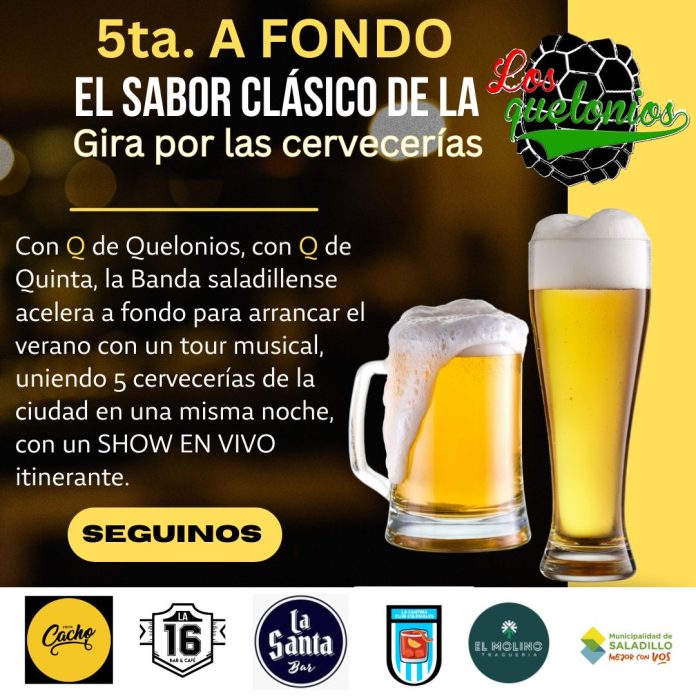 Saladillo/BA. Con Q de Quelonios, con Q de Quinta, la Banda saladillense acelera a fondo para arrancar el verano con un tour musical, uniendo 5 cervecerías de la ciudad en una misma noche, con un show en vivo itinerante.