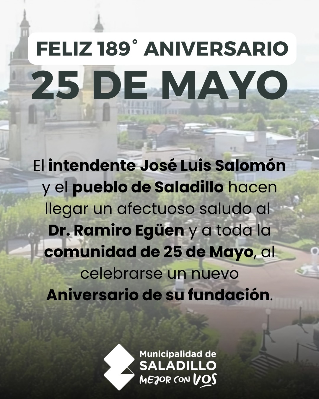 Saladillo/BA. El Intendente José Luis Salomón y el pueblo de Saladillo hacen llegar un afectuoso saludo al Dr. Ramiro Egüen y a toda la comunidad de 25 de Mayo, al celebrarse un nuevo aniversario de su fundación.