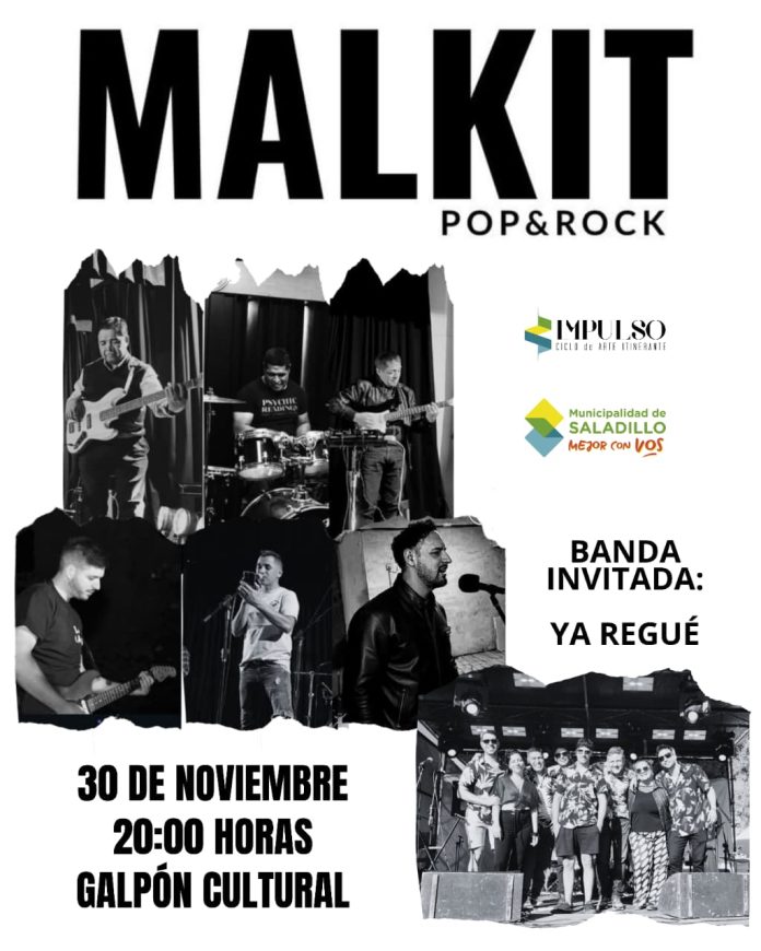 Buenas NoticiasdestacadosSaladilloImpulso presenta: MalkitPor Redación Saladillo - noviembre 28, 2025Saladillo/BA. Este domingo 30 de noviembre a las 20:00 horas, en el galón cultural. Banda invitada: Ya regué.