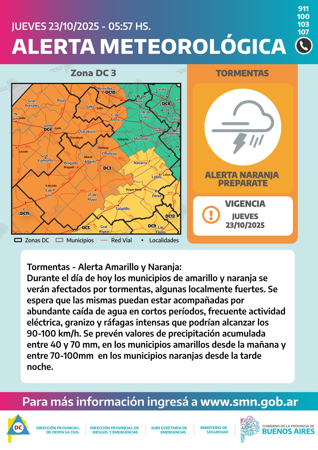 Saladillo/BA. Descripción alerta amarillo y naranja por tormentas. Desde la mañana de este jueves 23 de octubre un frente frío avanzará lentamente de oeste a este sobre la provincia, afectando principalmente la franja oeste bonaerense con lluvias y tormentas.