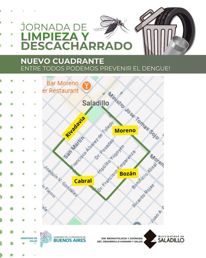 Saladillo/BA. La Dirección de Bromatología y Zoonosis de la Municipalidad de Saladillo informa a la comunidad que, a partir de mañana jueves 20 de noviembre, comenzará la segunda etapa de la Jornada de Limpieza y Descacharrado en el cuadrante comprendido entre las calles Rivadavia, Bozán, Cabral y Moreno, junto a promotoras/es comunitarias/os de la Provincia de Buenos Aires.