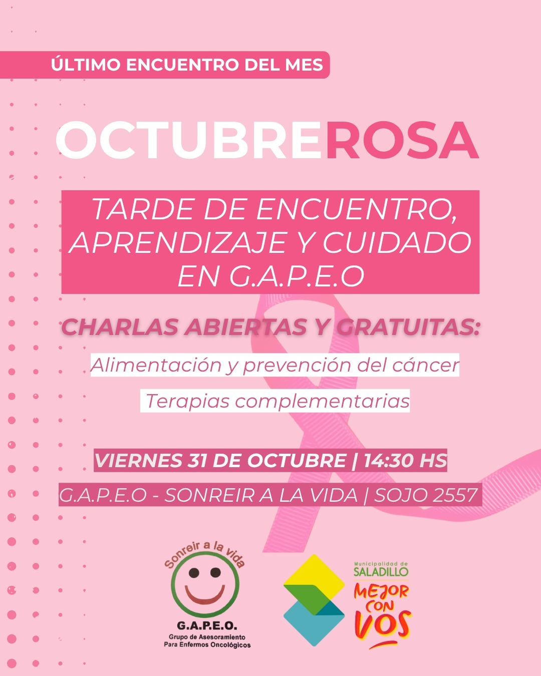 Saladillo/BA. Junto a GAPEO – “Sonreír a la Vida”, te esperamos para seguir promoviendo la prevención y el acompañamiento. Este viernes 31 de octubre a las 14:30 hs, en la calle ministro Sojo nº 2557.