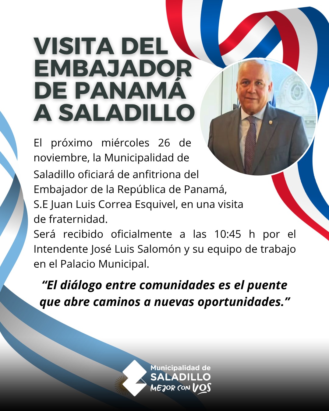 Saladillo/BA. Mañana 26 de noviembre, la Municipalidad de Saladillo oficiará de anfitriona del embajador de la República de Panamá, Juan Luis Correa, en una visita de fraternidad. Será recibido oficialmente a las 10:45 h por el Intendente José Luis Salomón y su equipo de trabajo en el Palacio Municipal, en una jornada que incluirá distintas actividades destinadas a conocer la producción local, fortalecer vínculos institucionales, comerciales y promover el desarrollo turístico.