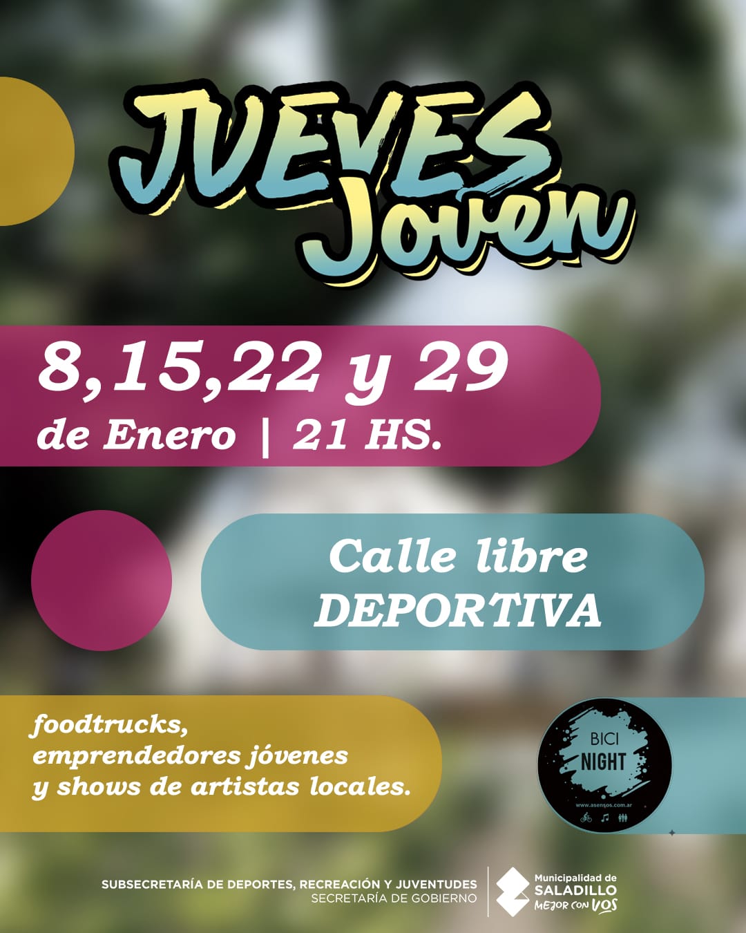 Saladillo/BA. Llegan los «Jueves Joven y calle libre deportiva». Los dias 8, 15, 22 y 29 de enero a partir desde las 21 hs en la Plaza principal.