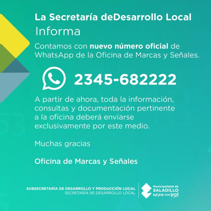 Saladillo/BA. Con el objetivo de agilizar la gestión de trámites y centralizar la recepción de documentación, la Oficina de Marcas y Señales de la Municipalidad de Saladillo ha habilitado una nueva línea de comunicación oficial.