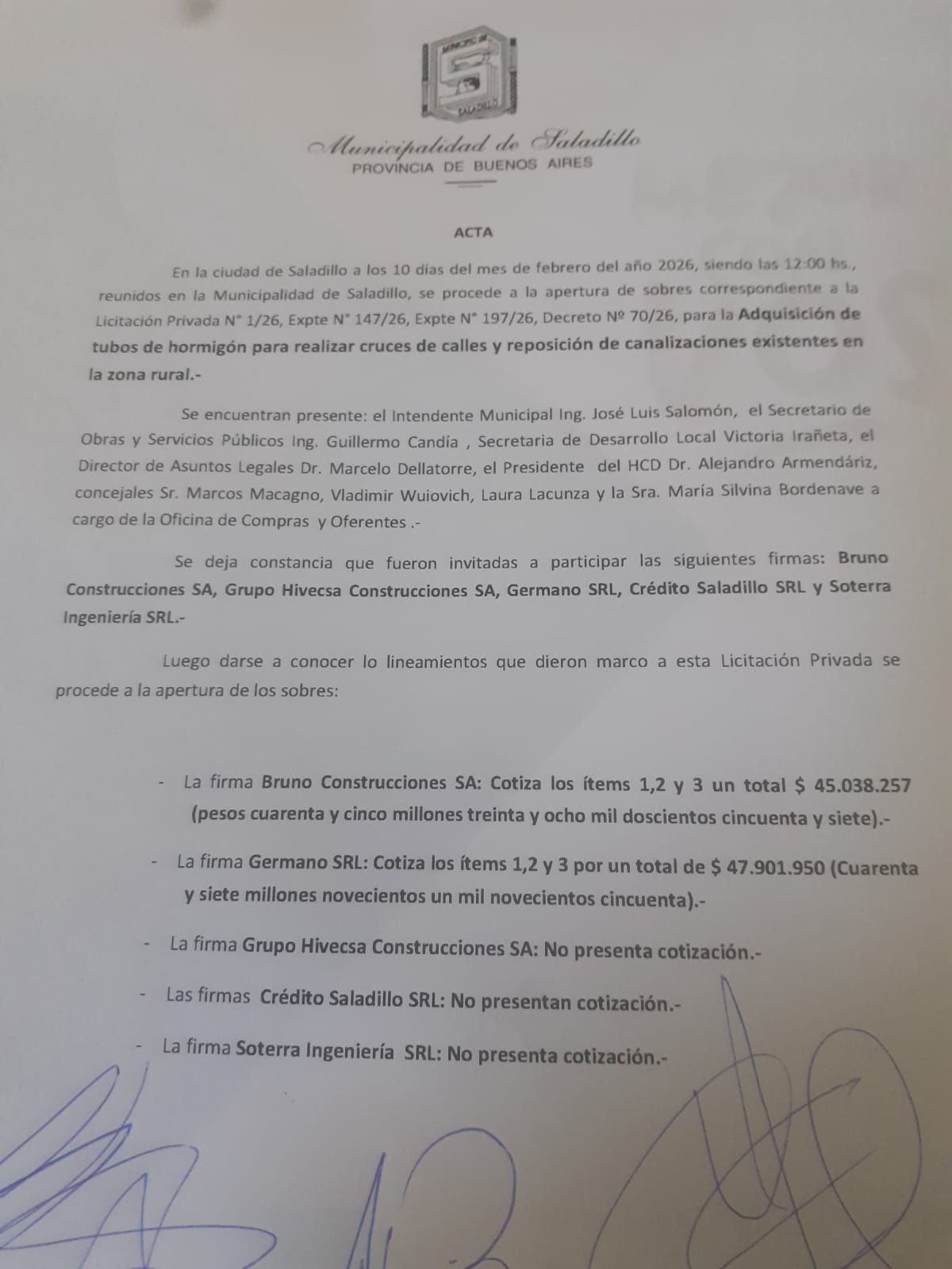 Saladillo/BA. En el Salón Sesquicentenario Gobernador Dr. Alejandro Armendáriz se llevó a cabo la apertura de sobres de la Licitación Privada N° 1 del presente año para la adquisición de tubos de hormigón para realizar cruces de calles y caminos y la reposición de canalizaciones existentes en el sector rural del distrito.