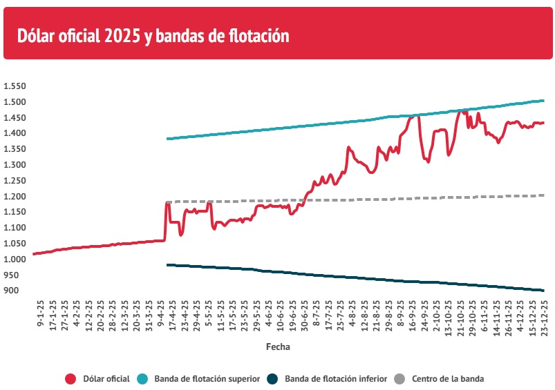 El sistema de bandas cambiarias vigente se pactó con el FMI antes del levantamiento parcial de restricciones cambiarias en abril. Bajo este mecanismo, el Banco Central está obligado a intervenir si el tipo de cambio se ubica fuera de los límites establecidos, que actualmente basculan de $919,04 a $1.522,05. El objetivo de la medida es atenuar la volatilidad y evitar saltos bruscos en la cotización del dólar.