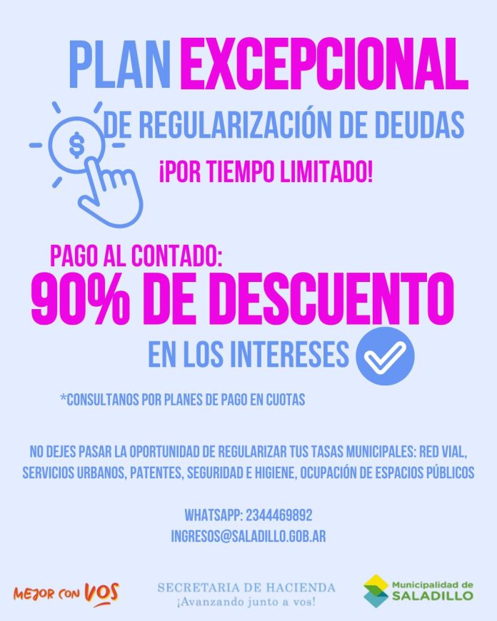 Saladillo/BA. La Municipalidad de Saladillo anunció la puesta en marcha de un nuevo plan de pagos destinado a regularizar deudas municipales, con importantes beneficios para contribuyentes.