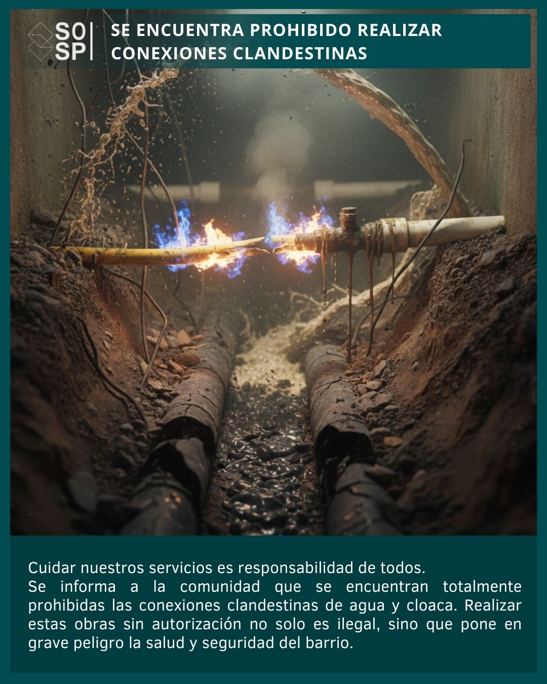 Se informa a la comunidad que se encuentran totalmente prohibidas las conexiones clandestinas de agua y cloaca. Realizar estas obras sin autorización no solo es ilegal, sino que pone en grave peligro la salud y seguridad del barrio.