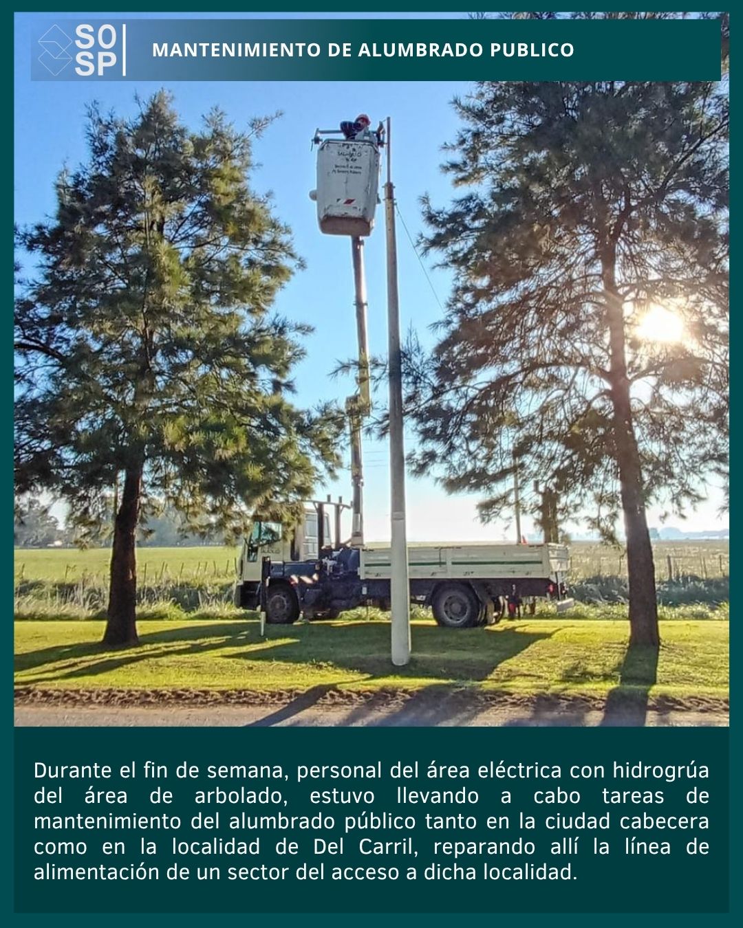 Saladillo/BA. Durante el fin de semana, personal del área eléctrica llevó adelante tareas de mantenimiento del alumbrado público en Saladillo y en la localidad de Del Carril.